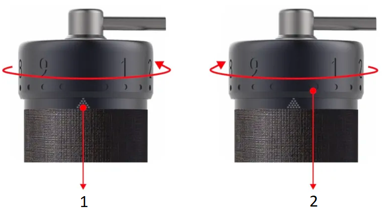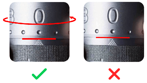 ![]() | Kohdista #0 asteikon merkkiin ja pohjaan säätörenkaan reuna koskettaa asteikon merkin ensimmäinen taso. |