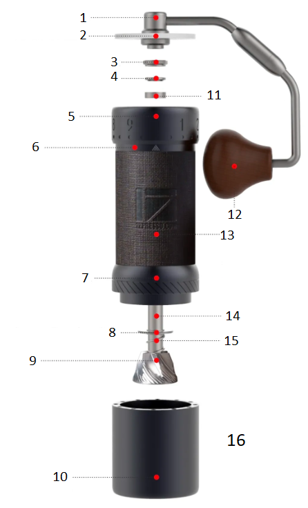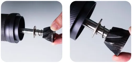 ![]() | Kiristä pyälletty siipimutteri kalibroidaksesi jauhinterää samalla painamalla terää alhaalta päin. Huomautus: Yhteensä on neljä ja puoli kierrosta laskettuna lähtöpisteestä. Lähtöpiste saattaa voi vaihdella ±10 napsautuksen tarkkuudella kiristysvoiman vuoksi mutteri ja valitsin. |