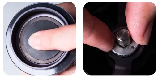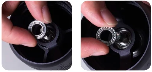 ![]() | Aseta osat takaisin oikeaan paikkaan järjestys: alempi laakerikansi (kohotettu reuna ylöspäin), jousi, akseli ja purse. |