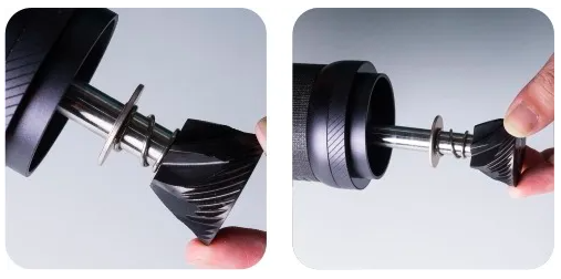 Käännä porarengasyksikköä eteenpäin (kierteet taaksepäin). Säätövalitsimen purkaminen ei ole ehdotettu. Älä puhdista jauhinmyllyä vedellä. Puhdistaminen harjalla ja puhaltimella on suositeltavaa. |
