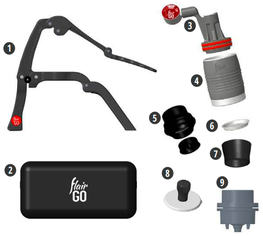 Sisältyy kaikkiin Flair 2GO-tilauksiin 1. Taitettava Flair 2GO runko 2. Flair 2GO Kantolaukku 3. Mäntä painemittarilla 4. Ei esilämmitettävää keittosylinteriä Sisältyy Grounds-malliin 5. Pohjaton 2-in-1 Portafilter 6. Stainless steel dispersion screen ( löytyy keittosylinterin sisältä ) 7. Annostelusuppilo 8. Flair 2GO Peukalointi Sisältyy Pods-malliin 9. Pod-suodatin |  |