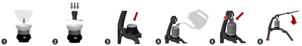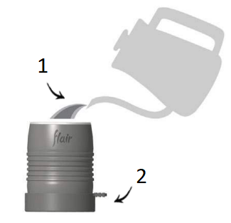 Flair 2GO-laitettasi ei tarvitse esilämmittää hyvän espresson uuton. Mutta jos käytät kevytpaahtoista kahvia tai haluat erityisen kuuman espresson, voit esilämmittää sylinterin. Suosittelemme kahta menetelmää. - Aseta sylinteri pystyasentoon kulhoon tai lavuaariin ja täytä kiehuvalla vedellä. Anna seistä 30 sekuntia. Poista varovasti.