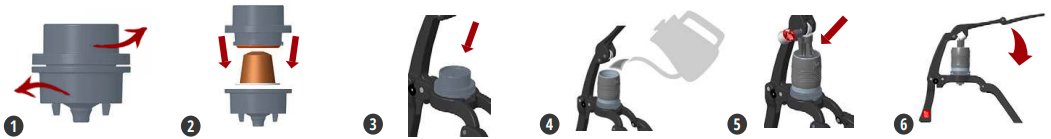 2. Lisää kapseli sovitettuun kammioon ja sulje se - Aseta kapseli ylempään sovitettuun kammioon folio ulospäin. Aseta pohja ja sulje kääntämällä. Sivulla olevat nuolet ovat kohdakkain suljettaessa.