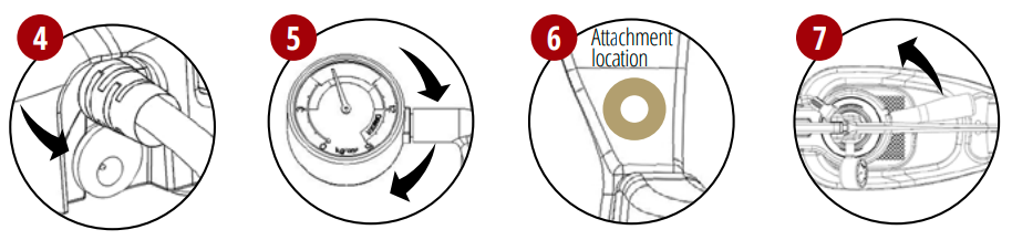5. Kiinnitä painemittari karaan kiertämällä myötäpäivään. Kierrä se kokonaan kiinni ja suuntaa sitten mittarin etuosa pystysuoraan.