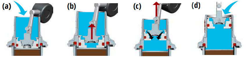 (a) Aloita vipu alhaalla ja täytä keittosylinteri reunaan asti vedellä. (b) Nosta vipua sen verran, että varsi irtoaa ja venttiili avautuu, jolloin vesi täyttää alla olevan ylätilan. (Heiluta vipua ilmataskujen minimoimiseksi.) (c) Jatka vivun nostamista hitaasti, jolloin vesi virtaa venttiilin läpi ja keittokammioon. (d) Täytä kammio varren ja männän välisen aukon kautta, kun vipu on täysin ylhäällä.