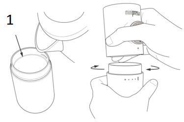 Täytä vesisäiliö riskin mukaan. Kohdista MiniPresso-laitteen runko säiliön pisteeseen ja aseta se säiliöön kääntämällä sitä myötäpäivään.